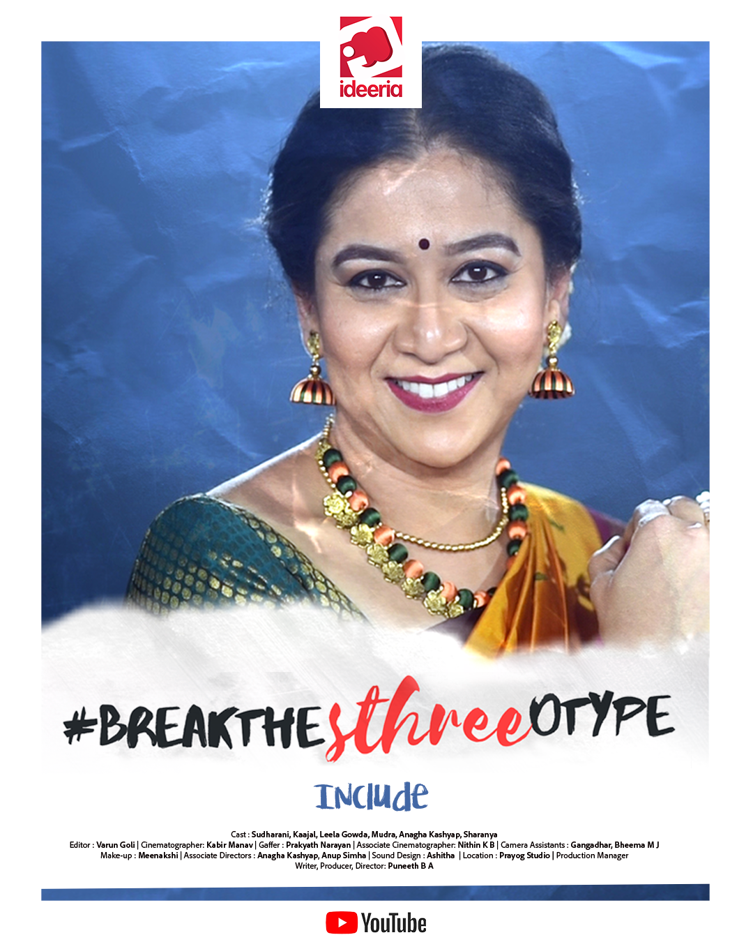 Break the Sthreeotype: Include, a short film that spotlights the importance of cultural integration for the third gender, particularly those who have chosen to identify as women. The film encourages embracing diversity and acceptance to ‘include’ and break the sthree-o-type! ( Sthree, English translation : Woman ) Storytellers: Prakash Rai, Ramesh Aravind, Jogi, Vijay Raghavendra, Shalini, Vijay Suriya, RJ Nethra, Sunil Rao, Hitha Chandrashekar, Rohit Bhanuprakash, Vikas Negiloni, AM Prakash, Gowri Dattu, Arunkumar, Aravind Kaushik, Pradeep Varma, Aravind Iyer, Sathish Sastry, Vasanth Shetty, Kiran Kaverappa, Shamitha Malnad , Ramkrishna Bellur, Sparsha RK, Rohit Bhat, Ganesh Karanth, Rakesh Raaj, Ram Manjjonnath, Rakesh Maiya, Anup Maiya, Asha Dwarakanth, Mekhala Kulkarni. Cast: Sudharani, Kaajal, Leela Gowda, Mudra, Anagha Kashyap, Sharanya Editor: Varun Goli Cinematographer: Kabir Manav Gaffer: Prakyath Narayan Associate Cinematographer: Nithin K B Camera Assistants: Gangadhar, Bheema M J Make-up: Meenakshi Associate Directors: Anagha Kashyap, Anup Simha Sound Design: Ashitha Location: Prayog Studio Production Manager: Hariprasad Producer: Puneeth Amarnath Writer, Director: Puneeth Amarnath